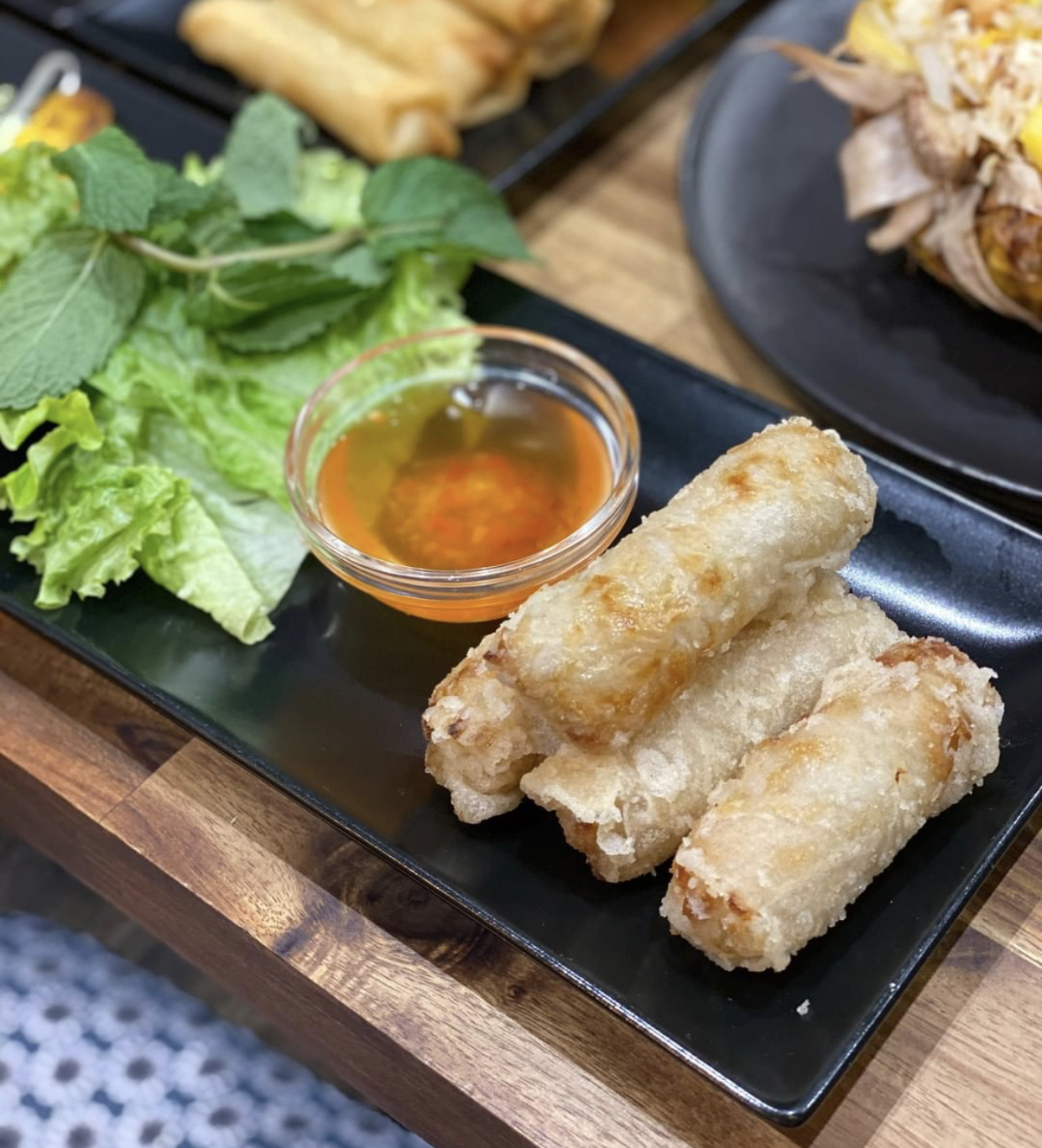 Accompagnées d'un riz gluant, accompagnée de crevettes panées