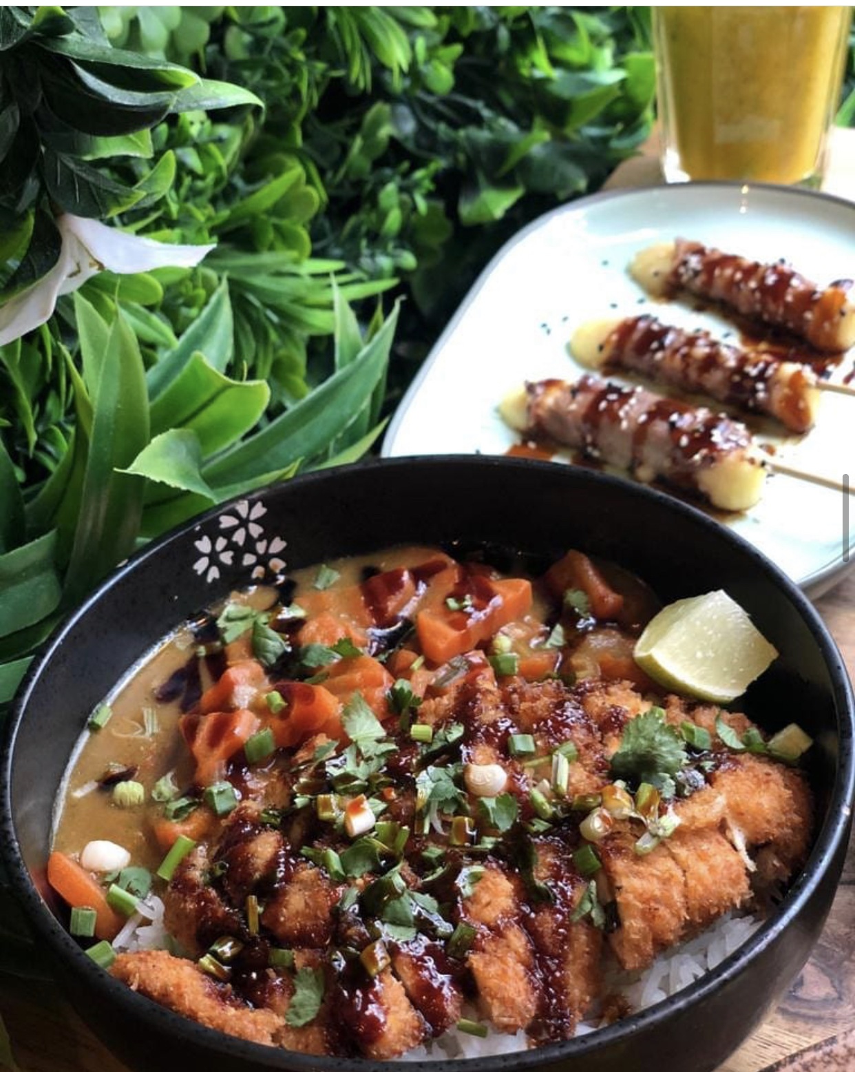 Un plat typique du Japon à base de poulet pané au crevettes panées sur un lit de riz et d'une sauce au curry japonaise.